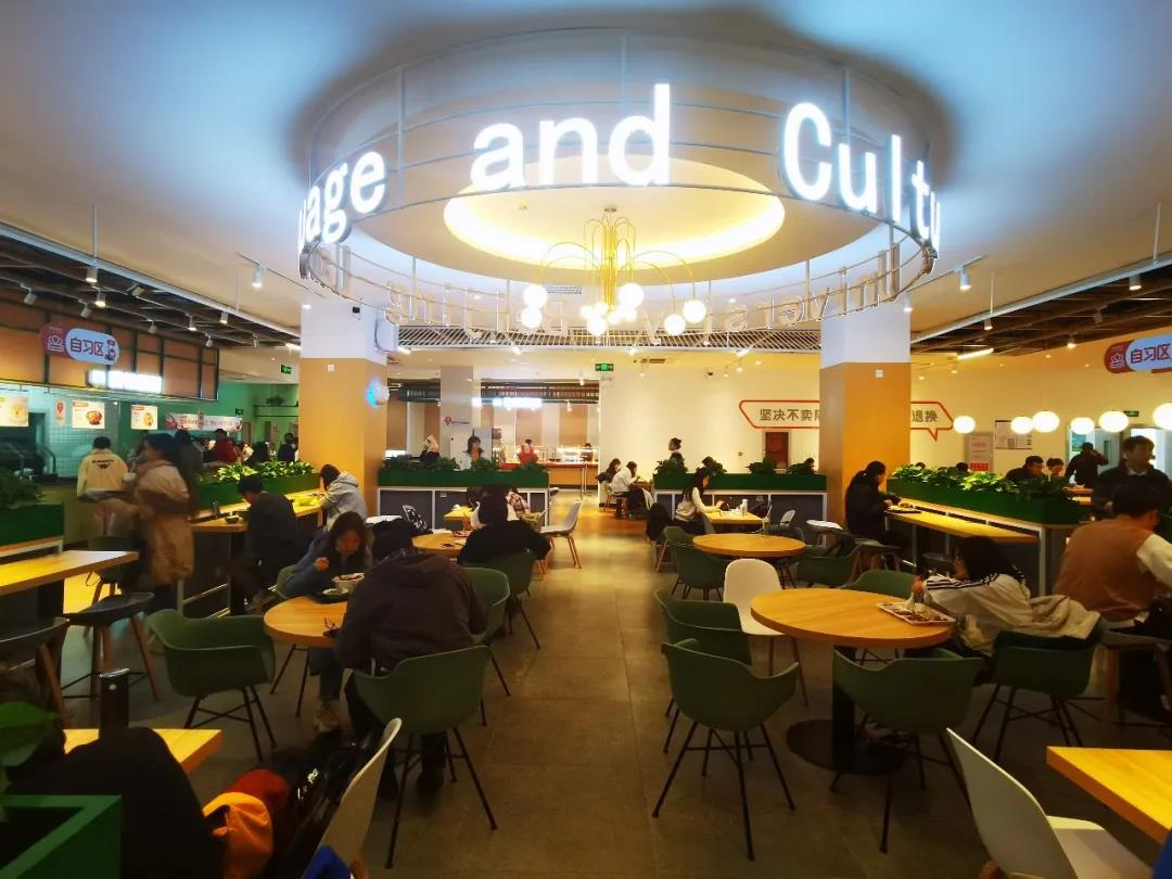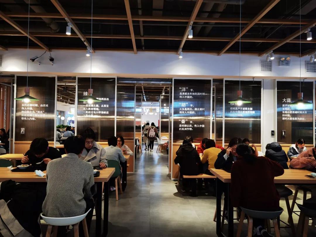 当我们问起食堂的设计理念时,陈经理告诉我们,新空间、新体验、新文化是快乐食间不同于其他食堂的特色理念。新空间让师生能在别致的环境中享受用餐时光,新体验是指同学们可以在食堂举办社团文化活动、班级活动、生日趴、快闪活动等,为同学们的大学生活增添色彩,新文化则是将北语的文化融入快乐食间,遵循“一校一店,一店一格”的原则,打造除教室、寝室之外的“第三空间”。