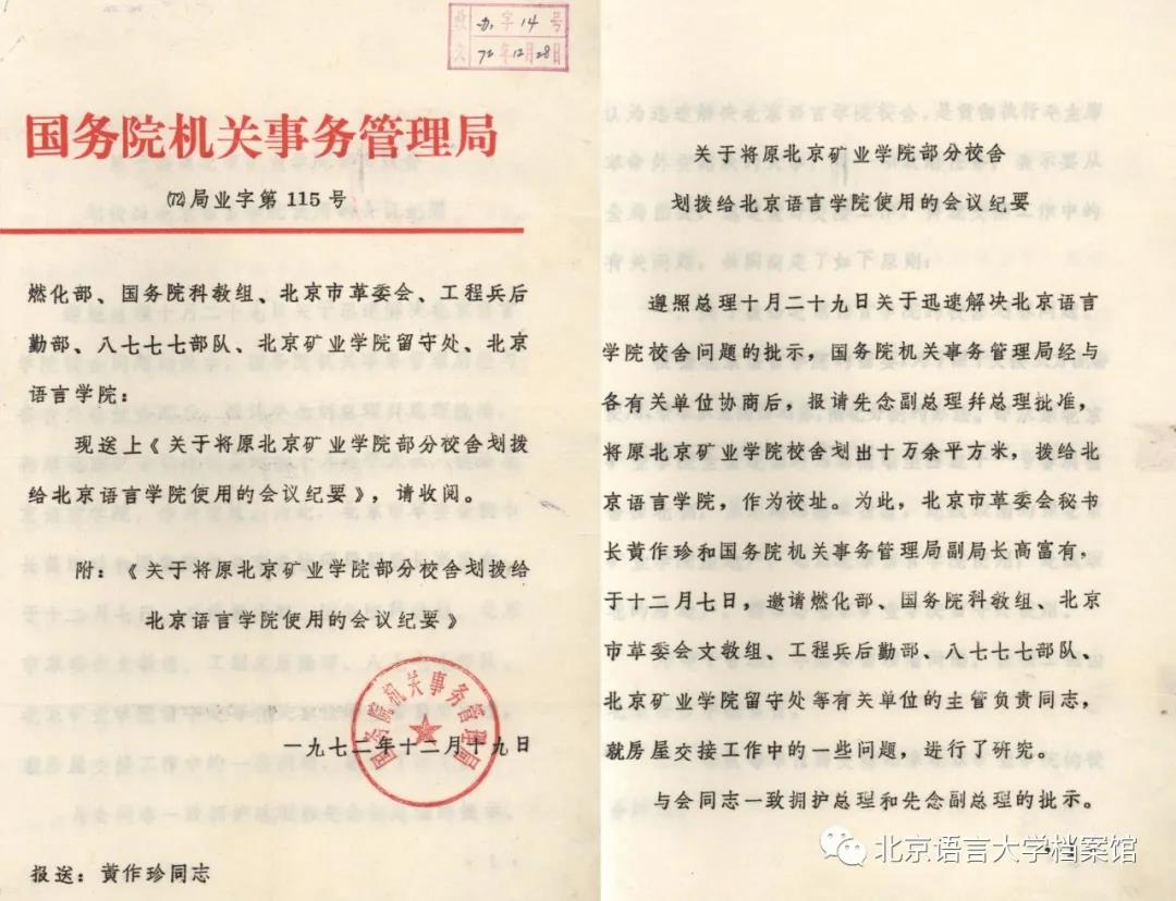 为解决北京语言学院复校后的校舍问题,周总理于1972年10月29日再次批示:“迅速解决北京语言学院校舍问题”。据此,国务院机关事务管理局与有关单位商定:“从原北京矿业学院主楼北侧的马路南墙至西边十一号眷属宿舍楼北侧,从东向西基本拉直,此线以南的原北京矿业学院房地产,划归北京语言学院使用;此线以北的房地产,仍留给北京矿业学院留守处使用。”1972年底,北京语言学院正式迁入北京市海淀区学院路15号新校址,开启了学校建设的新征程。