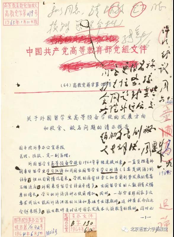 北语建校之初,来华留学生汉语部(简称“来华部”)和出国留学生培训部(简称“出国部”),分别承担外国留学生汉语和出国留学生外语预备教育。1965年1月9日,周总理在高教部党组《关于外国留学生高等预备学校的发展方向和校舍、校名问题的请示报告》上批示:“同意更改名称,扩大任务”。1965年学校将1964年6月成立的出国师资系改为外语系,培养出国师资外语。至此,北京语言学院肩负起教授外国留学生汉语与中国文化和中国学生外语的神圣使命,为学校未来发展开辟了广阔的前景,为建立“桃李满天下”的国际型大学奠定了坚实的基础。