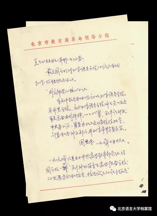 “文化大革命”期间,“四人帮”一伙污蔑北语为“黑学校”、“特务学校”。周总理于1970年7月26日亲自写信给外交部:“有文件报告和批示证明,北京语言学院并非黑学校,应向北京语言学院师生员工及各有关方面进行解释,以了此案。”同年8月6日,北京市教育局领导小组致函北语军宣队,传达周总理为北语平反恢复名誉的批示,广大教职员工闻讯后拍手称快。