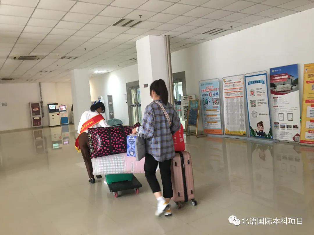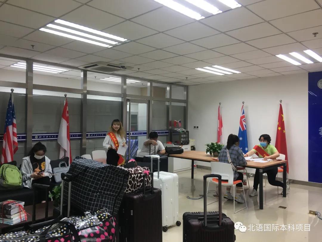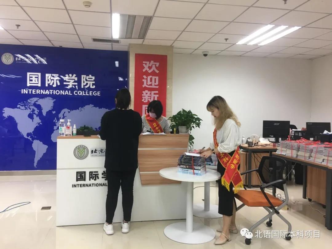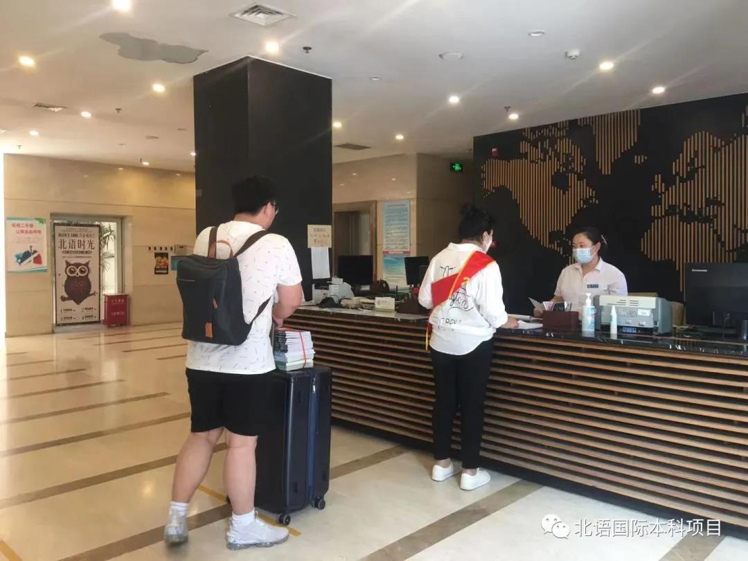 学校工作人员为新生进行体温检测与登记核验,引导新生刷脸进校;国际学院全体教务老师耐心指导新生办理报道手续,并协助新生领取一卡通与教材、运送行李,以及入住宿舍。