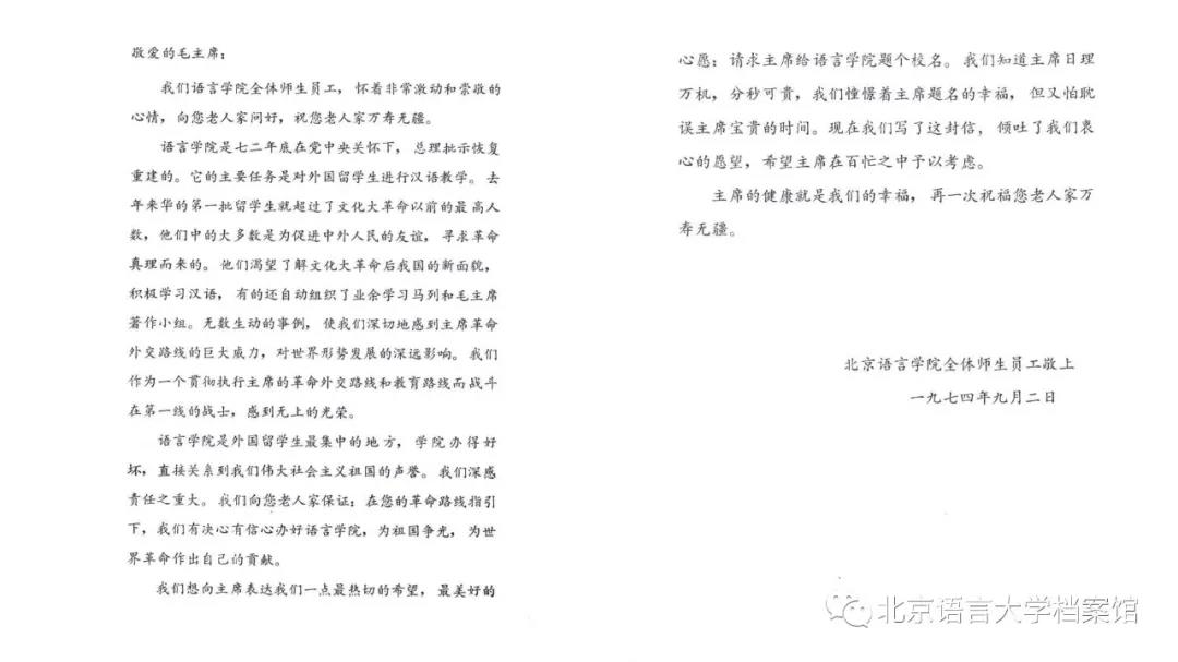 据李老师所述,当时请毛主席题写校名的建议是由当时语言学院的领导小组提出来的,这是一个基于学校特色和当时国际形势所做出的重大决定。由于60年代北京语言学院成立革命委员会时,学校委派了李老师执笔向毛主席发致敬电,所以这一次给毛主席致信的任务也交在了李老师的手中。