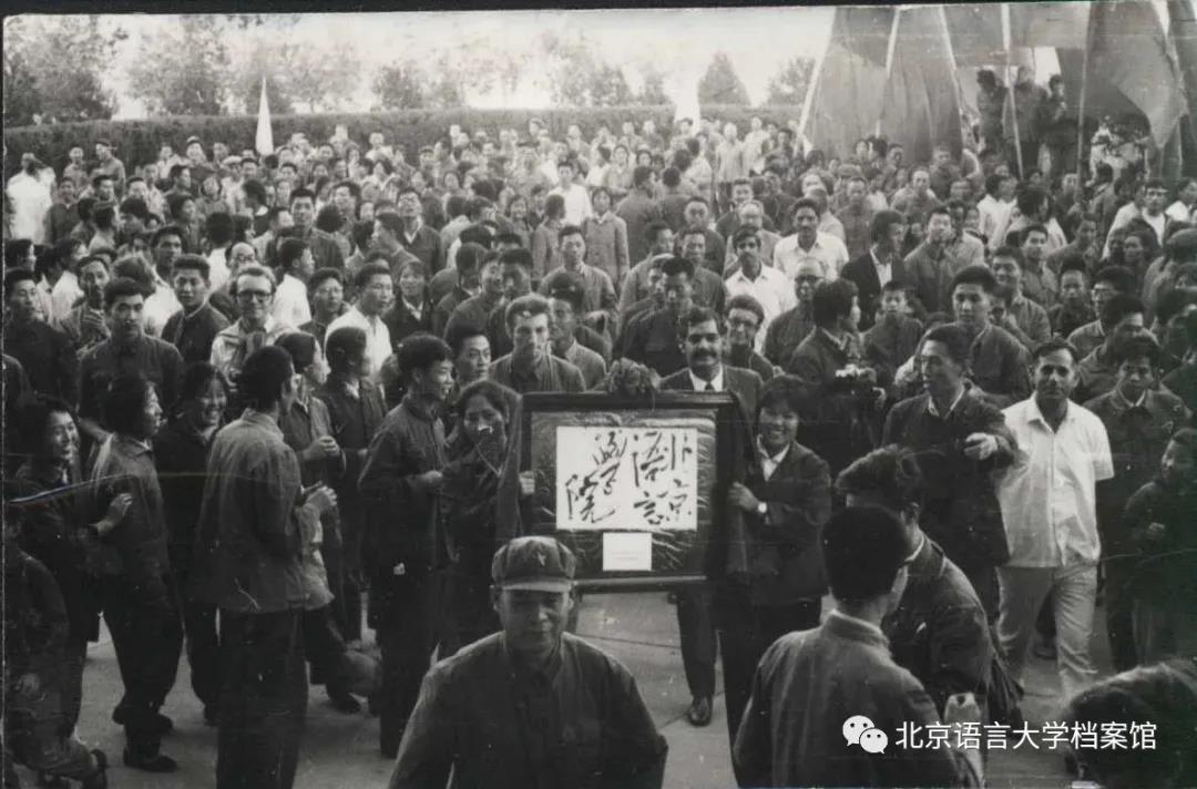 书信上交的一周后,毛主席就把题字写好了,“北京语言学院”六个大字横向排列、错落有致,据说这是毛主席最后一次为高校题写校名。9月13日,学校选派两个人去“敬请”毛主席的题字回学校,全校师生敲锣打鼓,夹道欢迎,人人脸上洋溢着喜悦与自豪。