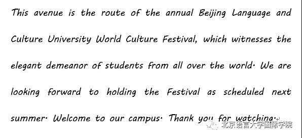 谈及那条用于滑板练习的林荫路,皮浚轩同学说道:“这是每年北京语言大学世界文化节的路线,见证了各国学子的风采。期待明年夏天游园会能如期举办,欢迎各位同学来校园参观!”