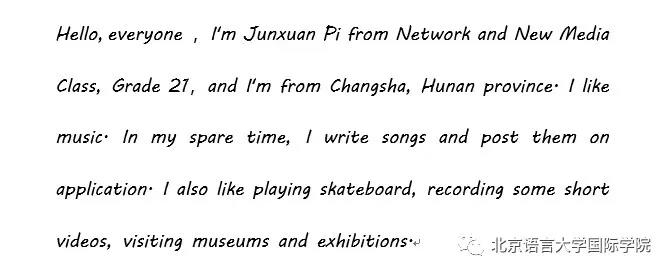 皮浚轩,湖南长沙人,目前就读于北京语言大学2+2国际本科项目2021级网络与新媒体班。他勤奋好学,爱好广泛,平时喜欢吉他弹唱、创作歌曲、玩滑板、录视频和看艺术展览。