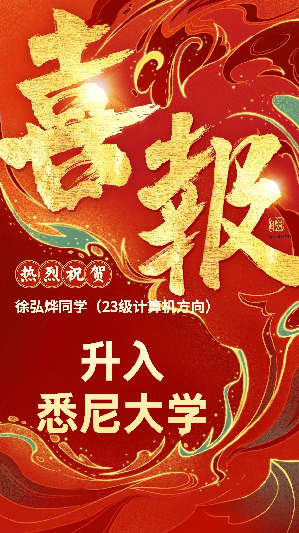 祝愿徐弘烨同学在悉尼大学学习顺利,前程似锦!