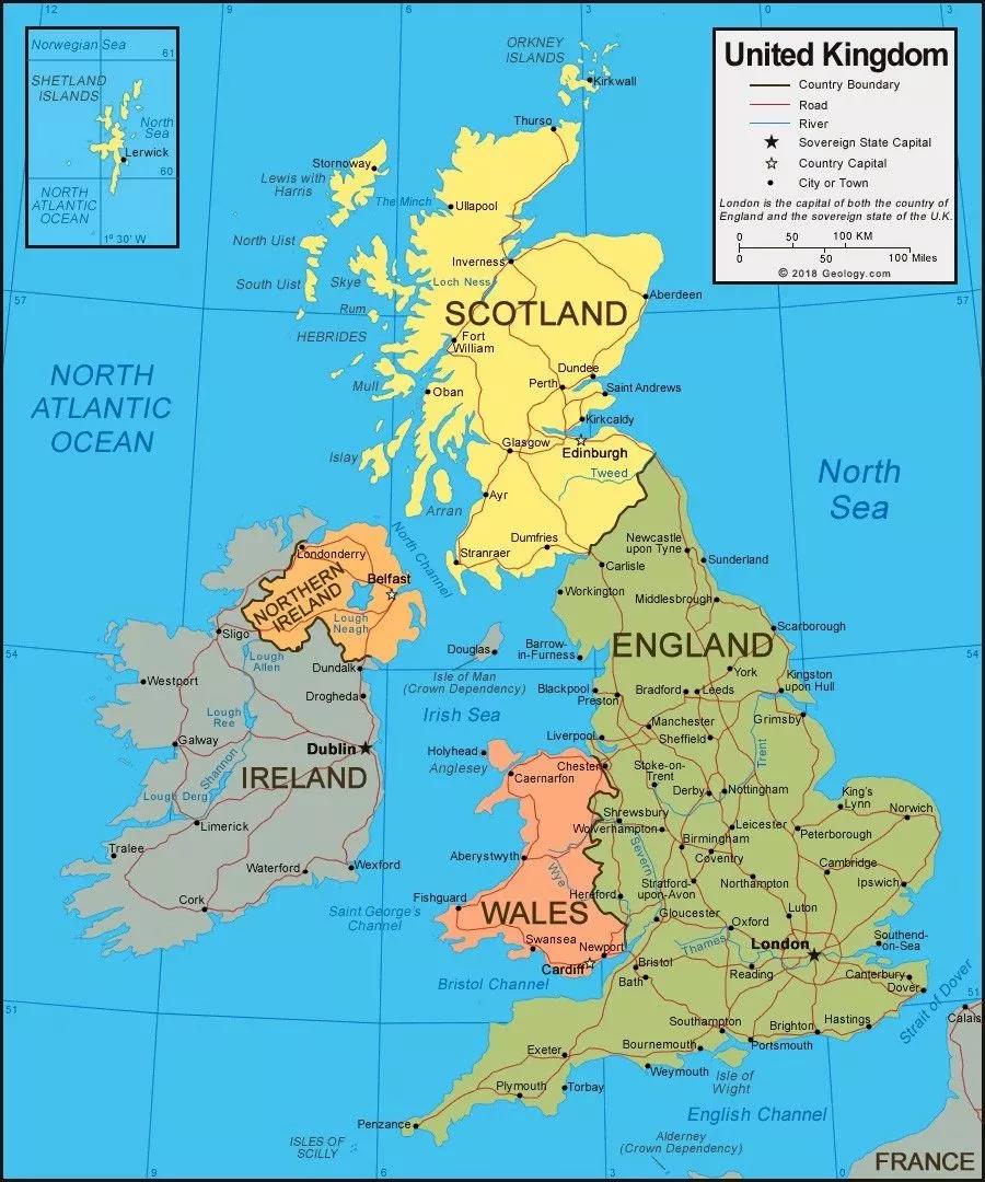 英国,即大不列颠及北爱尔兰联合王国(The United Kingdom of Great Britain and Northern Ireland),简称“英国”。本土位于欧洲大陆西北面的不列颠群岛,被北海、英吉利海峡、凯尔特海、爱尔兰海和大西洋包围。英国是由大不列颠岛上的英格兰、威尔士、苏格兰、爱尔兰岛东北部的北爱尔兰以及一系列附属岛屿共同组成的一个欧洲西部岛国。除本土之外,英国还拥有十四个海外领地。总人口超过6600万,其中以英格兰人(盎格鲁-撒克逊人)为主体民族,占全国总人口的83.9%。英国作为欧洲四大经济体之一,是一个高度发达的资本主义国家,也是全球最大的金融服务净出口国。其国民拥有极高的生活水平和良好的社会保障体系。